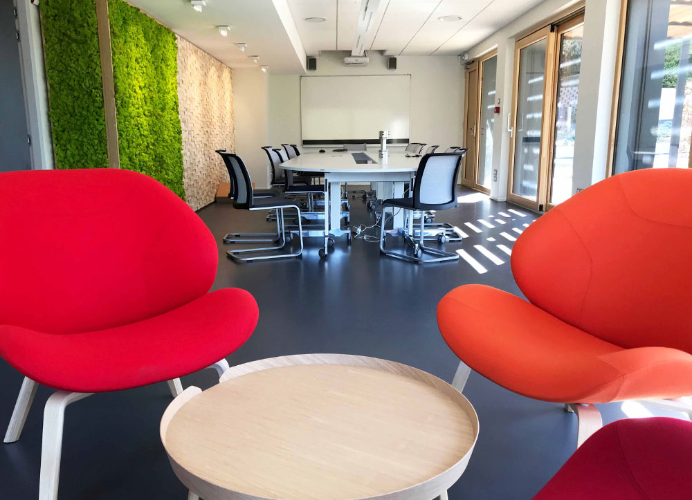 Les aménagements ont fait l’objet d’une concertation préalable avec les usagers avec l’intervention d’une ergonome. Chaque poste de travail est équipé d’un bureau électrique pour alterner entre la position debout et assise. Le bâtiment est largement vitré, il est lumineux. La qualité sanitaire du bâti a été étudiée avec soin jusqu’aux poignées de porte des sanitaires qui sont bactéricides. Un monitoring qualité de l’air intérieur a été mis en place. Le CO2 et l’hygrométrie dans les locaux font l’objet d’un suivi quotidien avec un affichage par pièce.