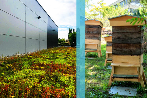 Le choix d’espèces locales a été privilégié dont des arbres et des arbustes fruitiers. Des installations ont été créées pour abriter les oiseaux, les petits rongeurs et les abeilles solitaires (hôtel à insectes) ainsi que des ruches. Pa d’arrosage automatique pour réduire la consommation d’eau. Les enrobés bitumeux ont été retirés du parking voiture pour permette aux eaux pluviales de s’infiltrer directement dans le sol et remplacés par des graviers issus du recyclage.