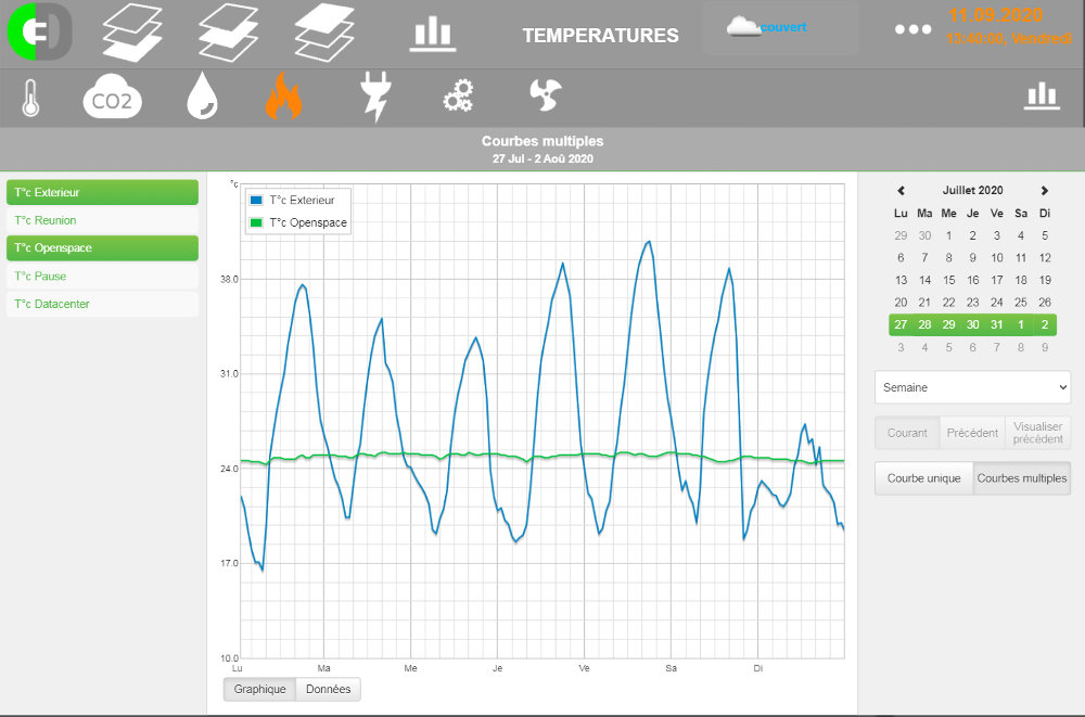 Avec mon smartphone, j’accède à toutes les fonctionnalités de fermeture des volets, des portails extérieurs, aux systèmes de sécurité …Les performances du bâtiment sont affichées en direct (énergie positive, autonomie, co2). Le bâtiment est équipé d’une GTB qui remonte les informations de près de 80 capteurs.
